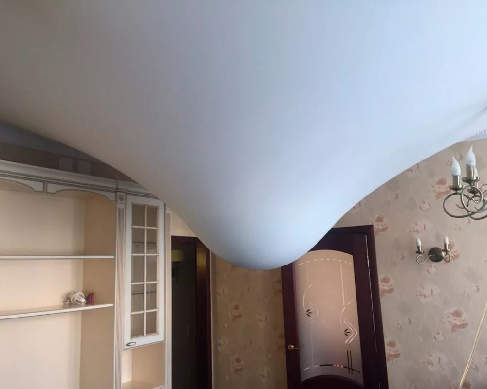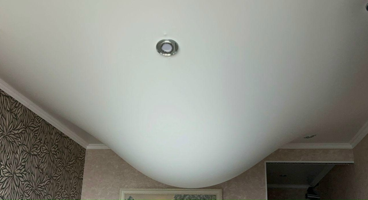 ПВХ-потолок удерживает до 100 литров воды на 1 м². Мы приезжаем в течение 1–4 часов, аккуратно сливаем воду через отверстие под светильник и сушим. Полотно после этого обычно восстанавливается полностью.
