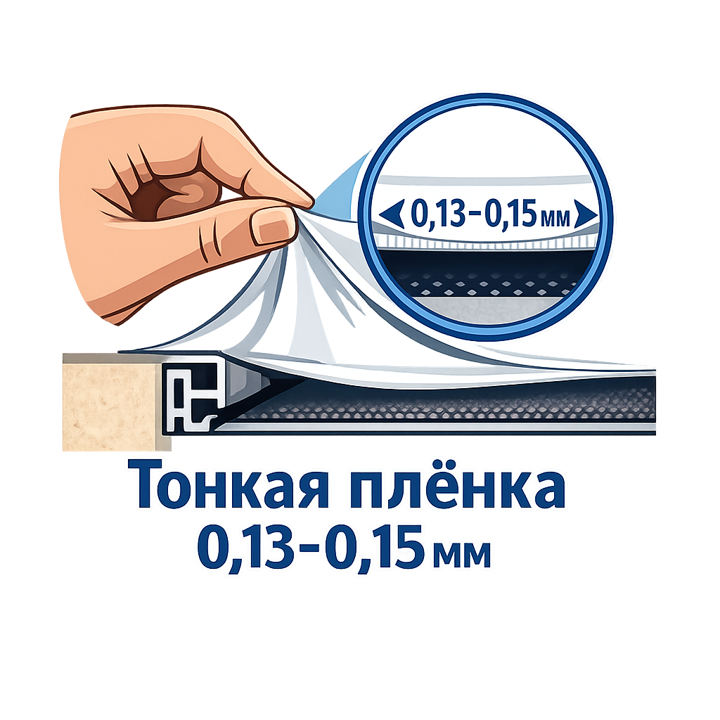 На глянцевых и сатиновых полотнах шов почти незаметен (тонкая линия 0,2–0,5 мм). На матовых — чуть заметнее, но при высоте потолка от 2,7 м его практически не видно. Ширина полотна до 5,2–5,3 м — большинство комнат без шва.